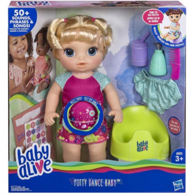 Lowest price in 30 days. Baby Alive Potty Dance Baby Blonde Straight Hair Baby speaks to Mommy or Daddy and sings to them Give baby her bottle and shell really pee on her potty Use included pretend soap dispenser to keep baby clean then pretend to wash her hands Read. The BEST thing about her is that even though she does drink shell only pee while on her potty so she doesnt need diapers.